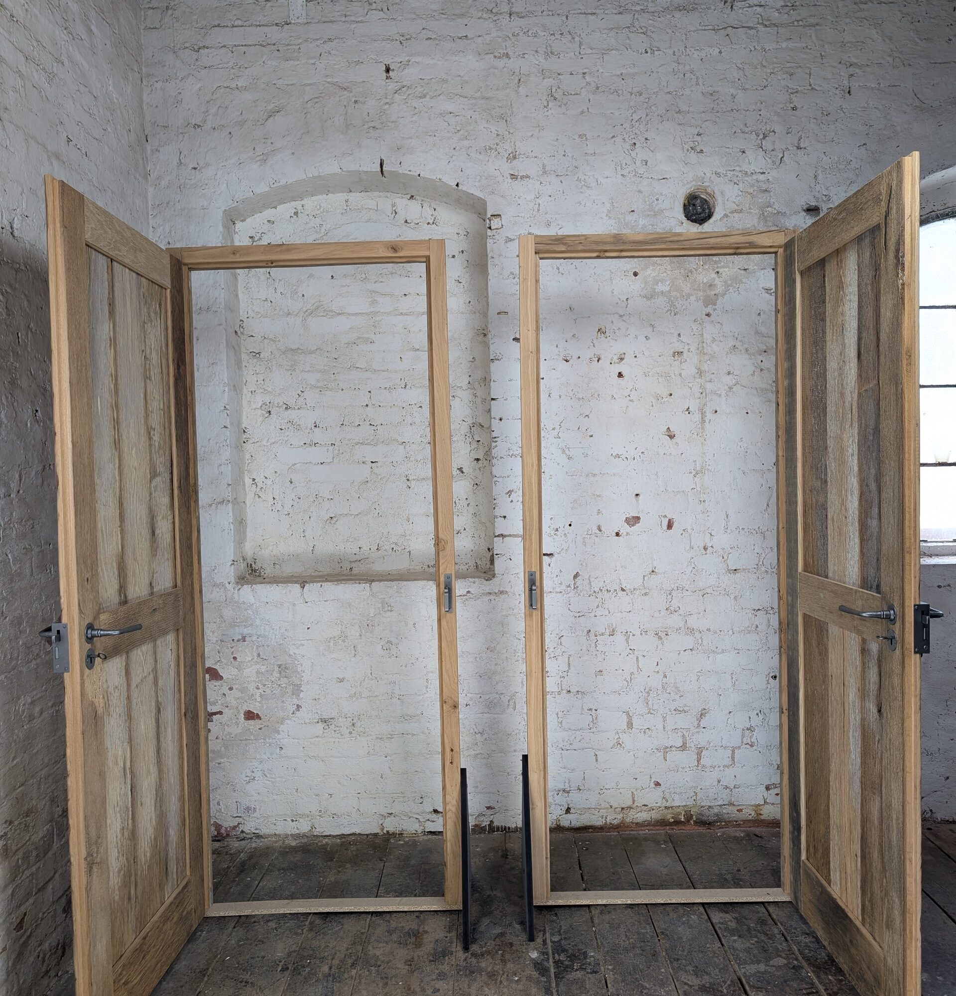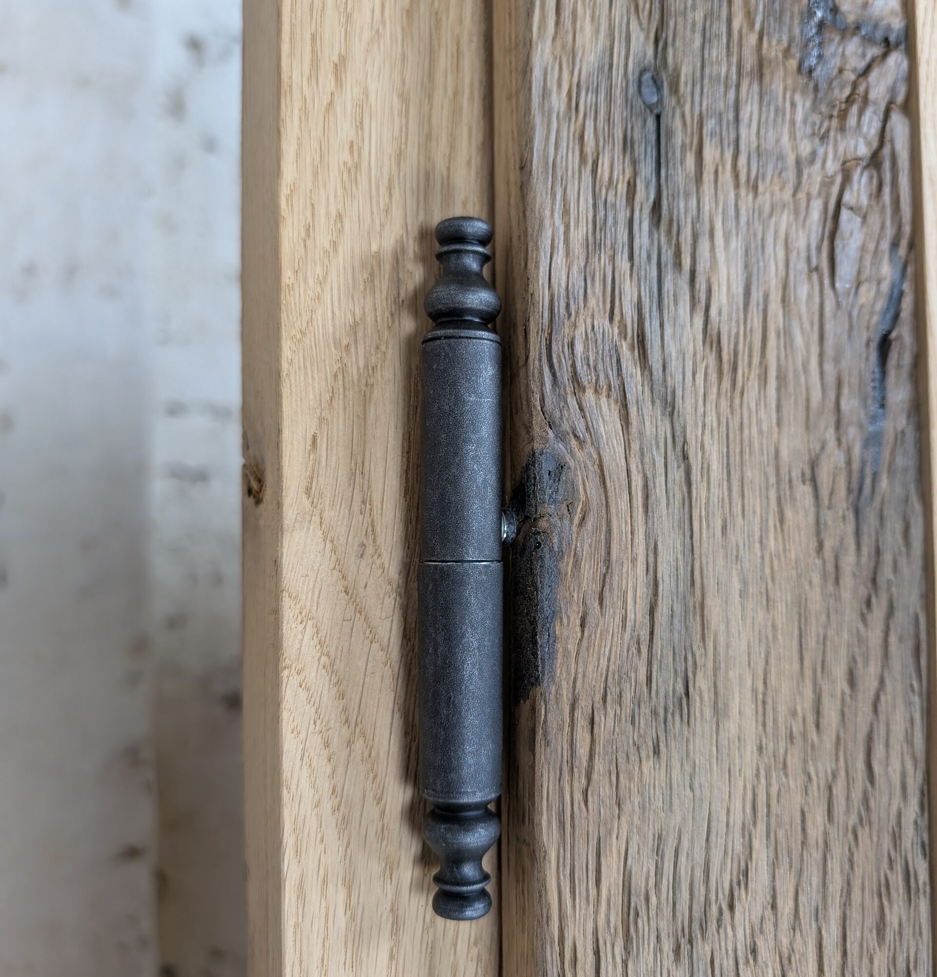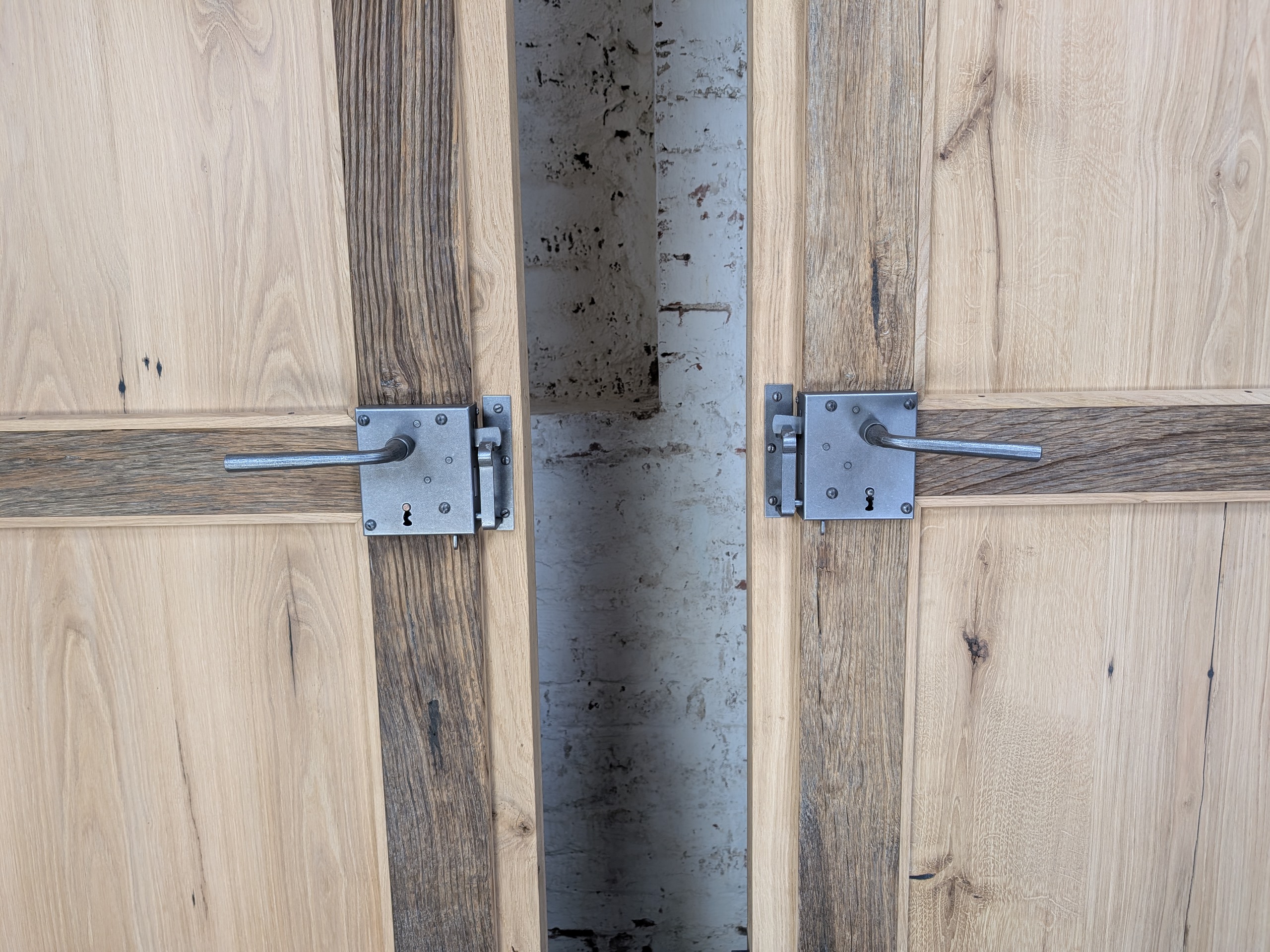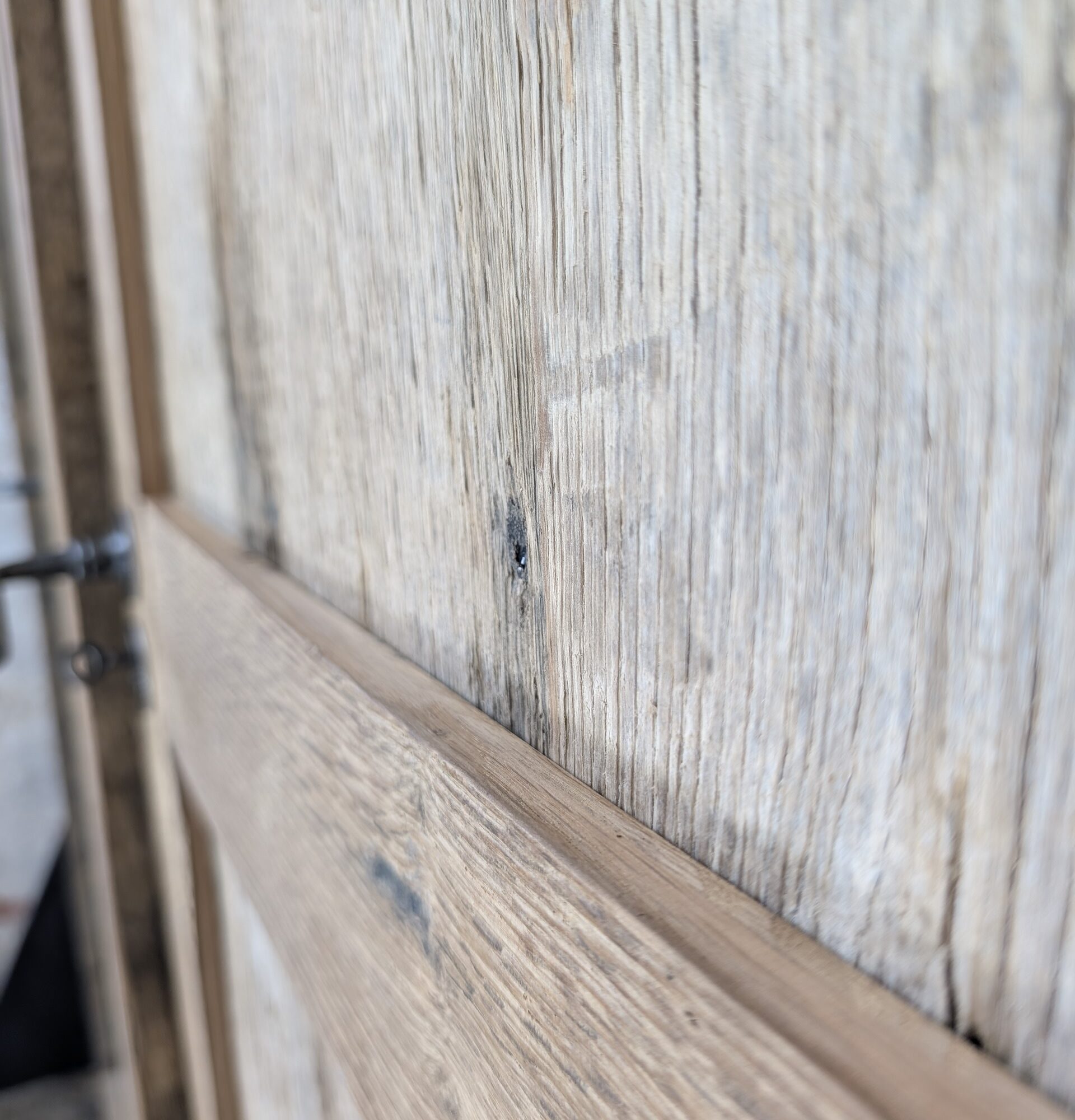 Die Füllungen bestehen aus sonnenverbrannten Eichenbrettern, einseitig mit original alter Oberfläche. Sie werden in geschraubten Leisten gehalten, sichtbar und ehrlich konstruiert. Konterprofile und Ausführungen sind stumpf gestoßen – nichts Verspieltes, nichts Verstecktes, sondern sauberes Handwerk.