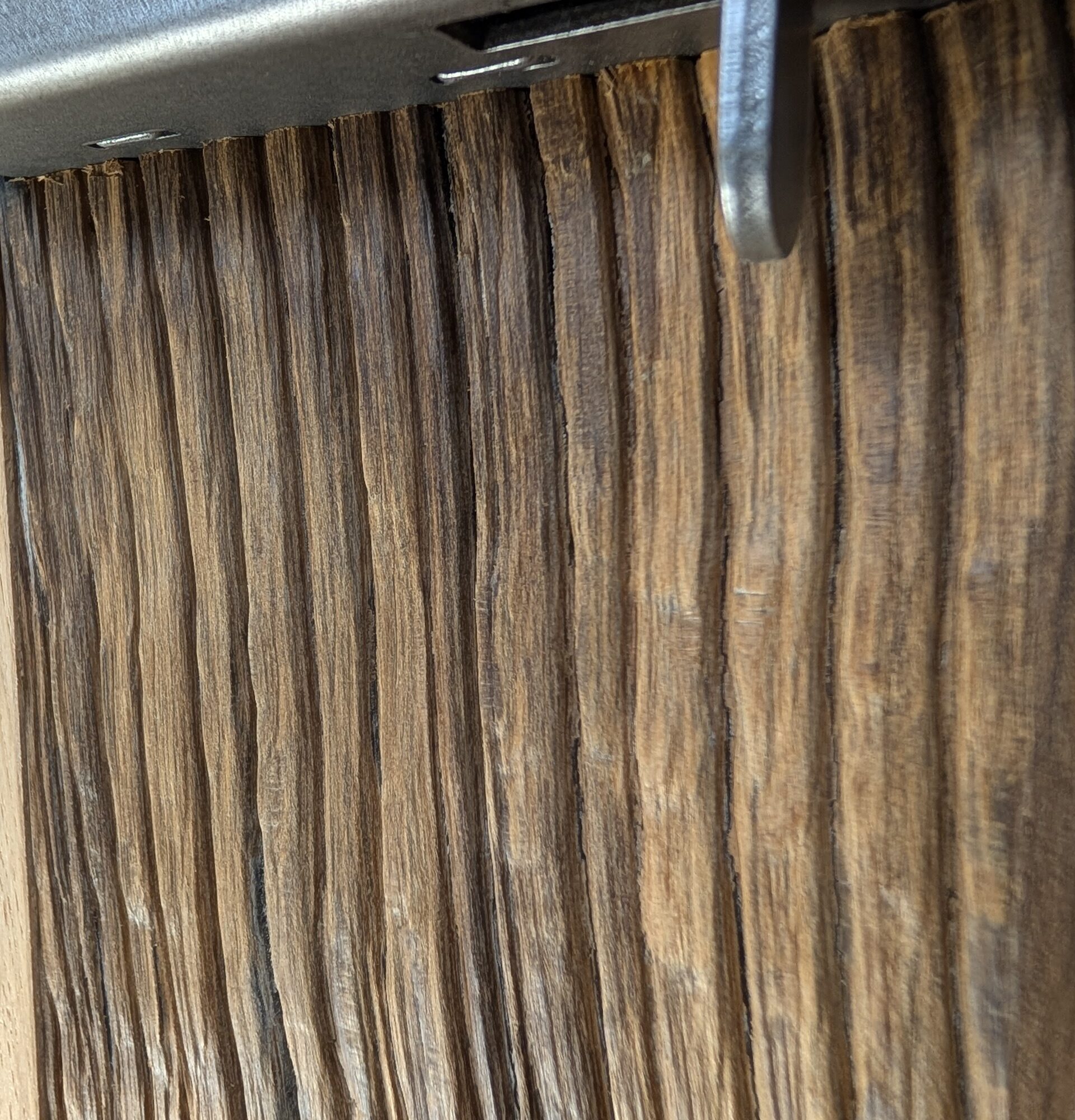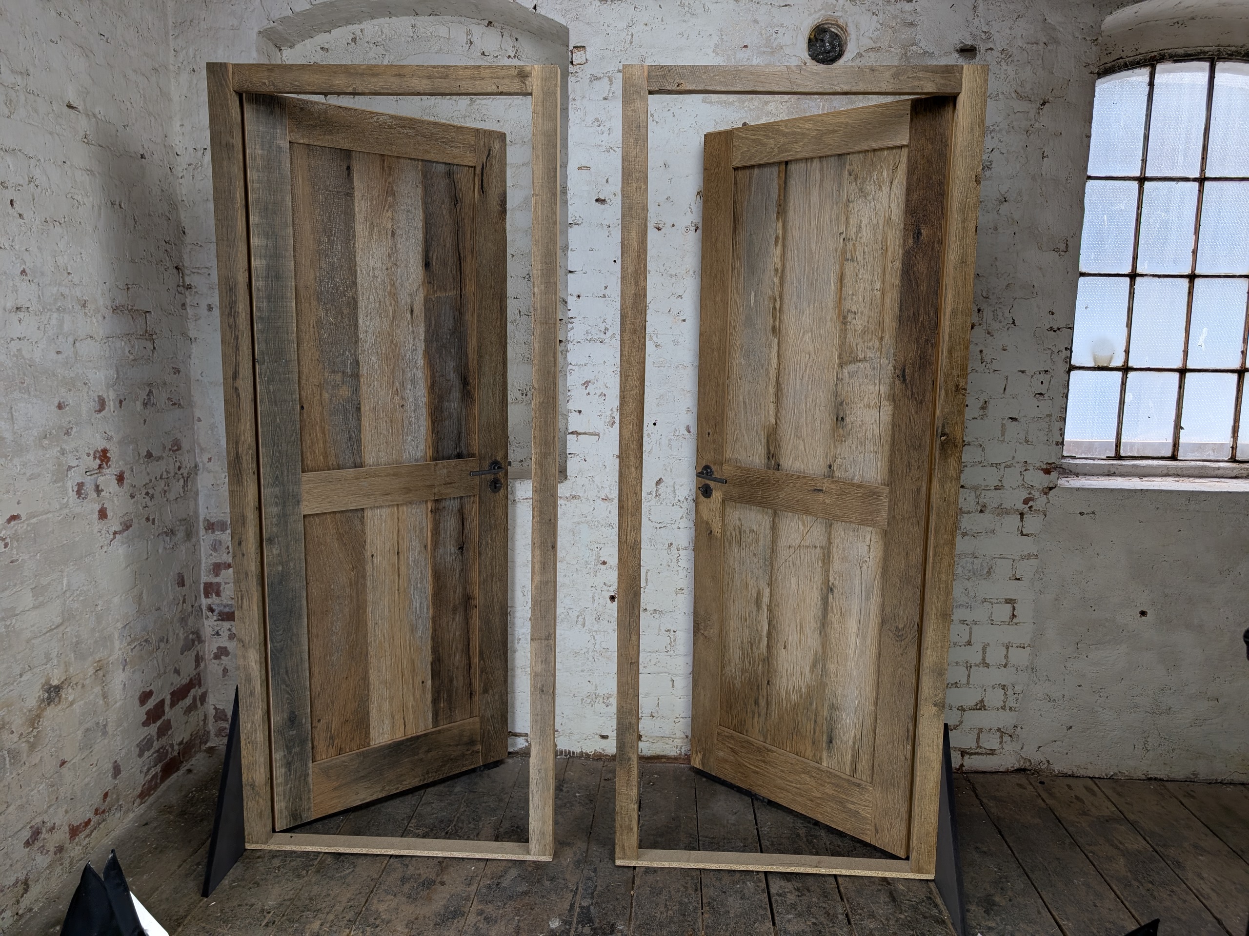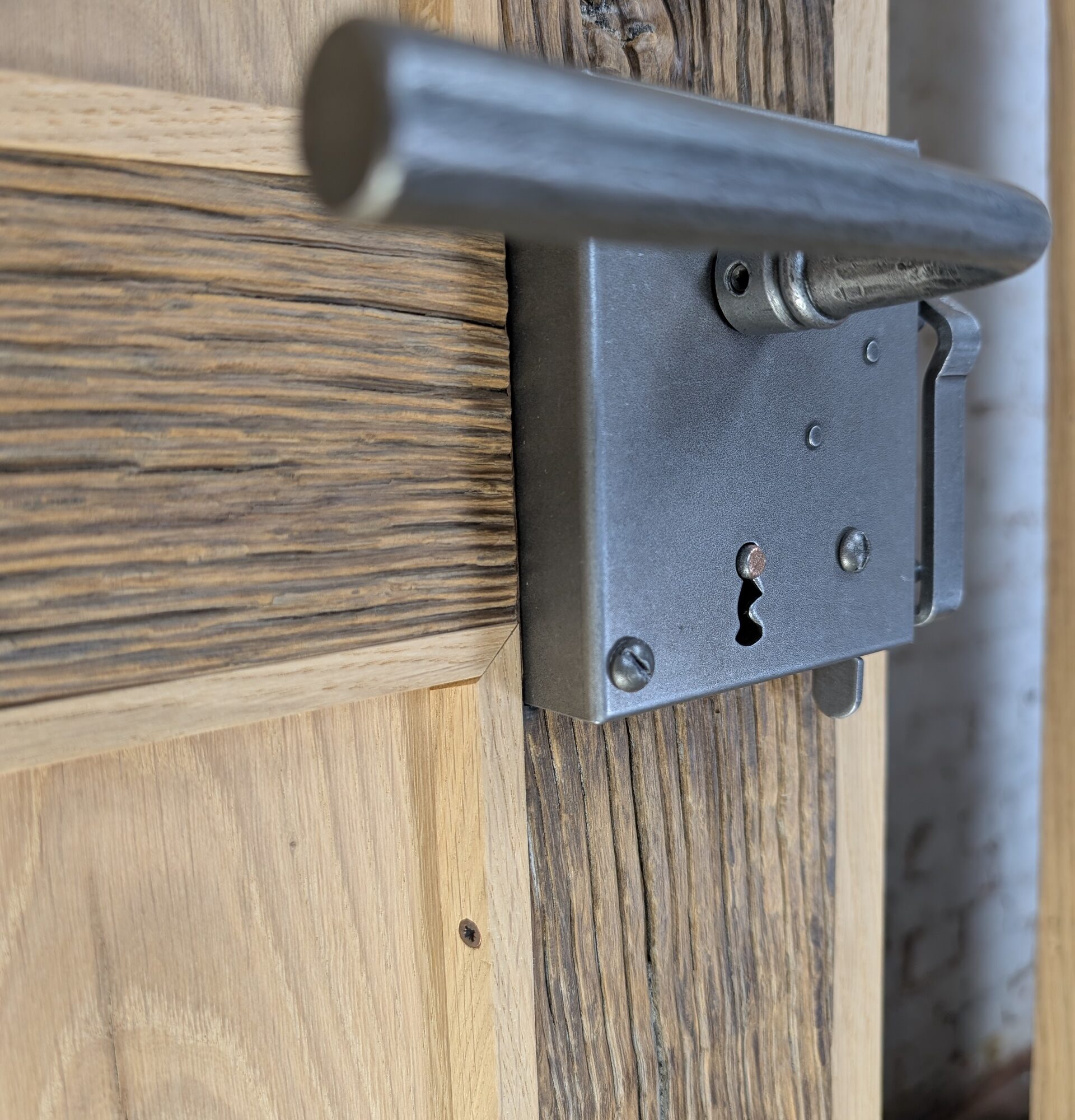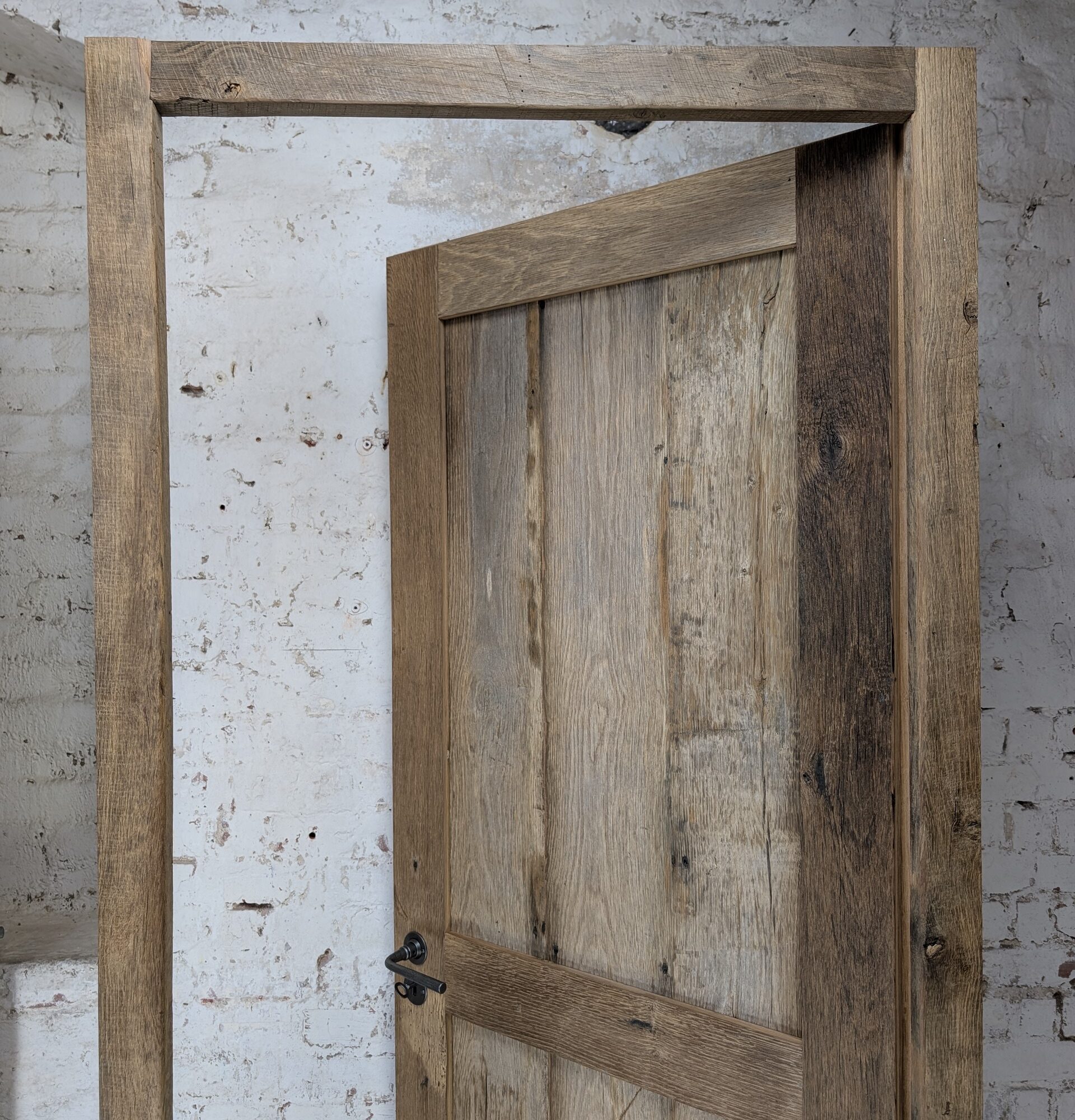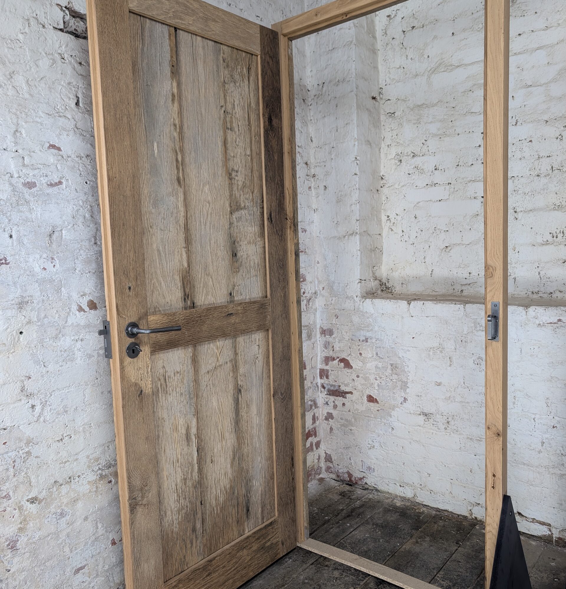 Die Füllungen bestehen aus sonnenverbrannten Eichenbrettern, einseitig mit original alter Oberfläche. Sie werden in geschraubten Leisten gehalten, sichtbar und ehrlich konstruiert. Konterprofile und Ausführungen sind stumpf gestoßen – nichts Verspieltes, nichts Verstecktes, sondern sauberes Handwerk.