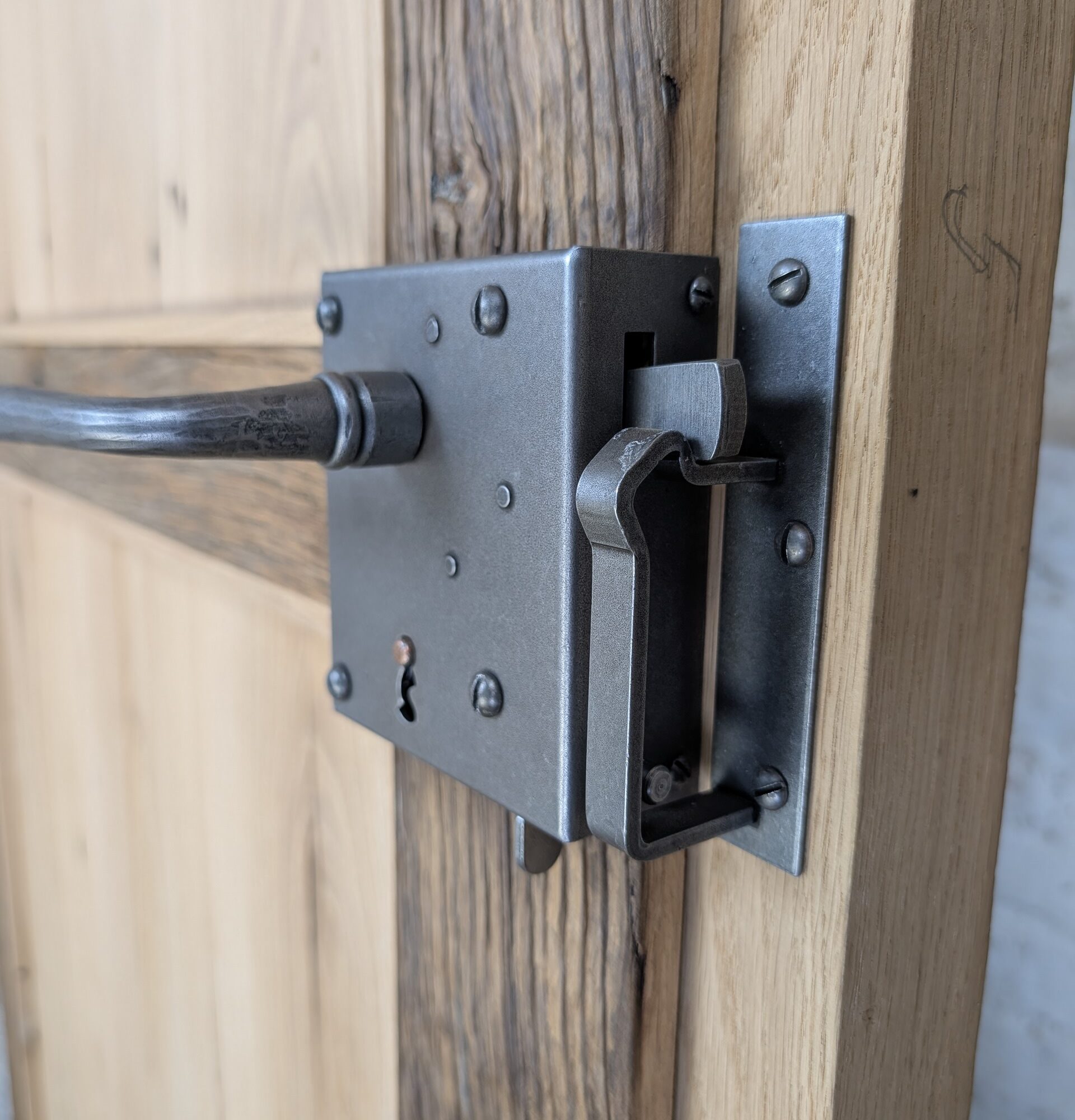 Türblatt und Blockrahmen bestehen aus ausgewählten historischen Hölzern. Der Blockrahmen wird aus alten Blockhausbohlen gefertigt, mit original alter Oberfläche und umlaufendem Falz. Die Rahmenteile sind bewusst kräftig dimensioniert, das obere Rahmenteil etwas breiter ausgeführt – eine kleine Geste, die der Tür zusätzlich Präsenz verleiht.