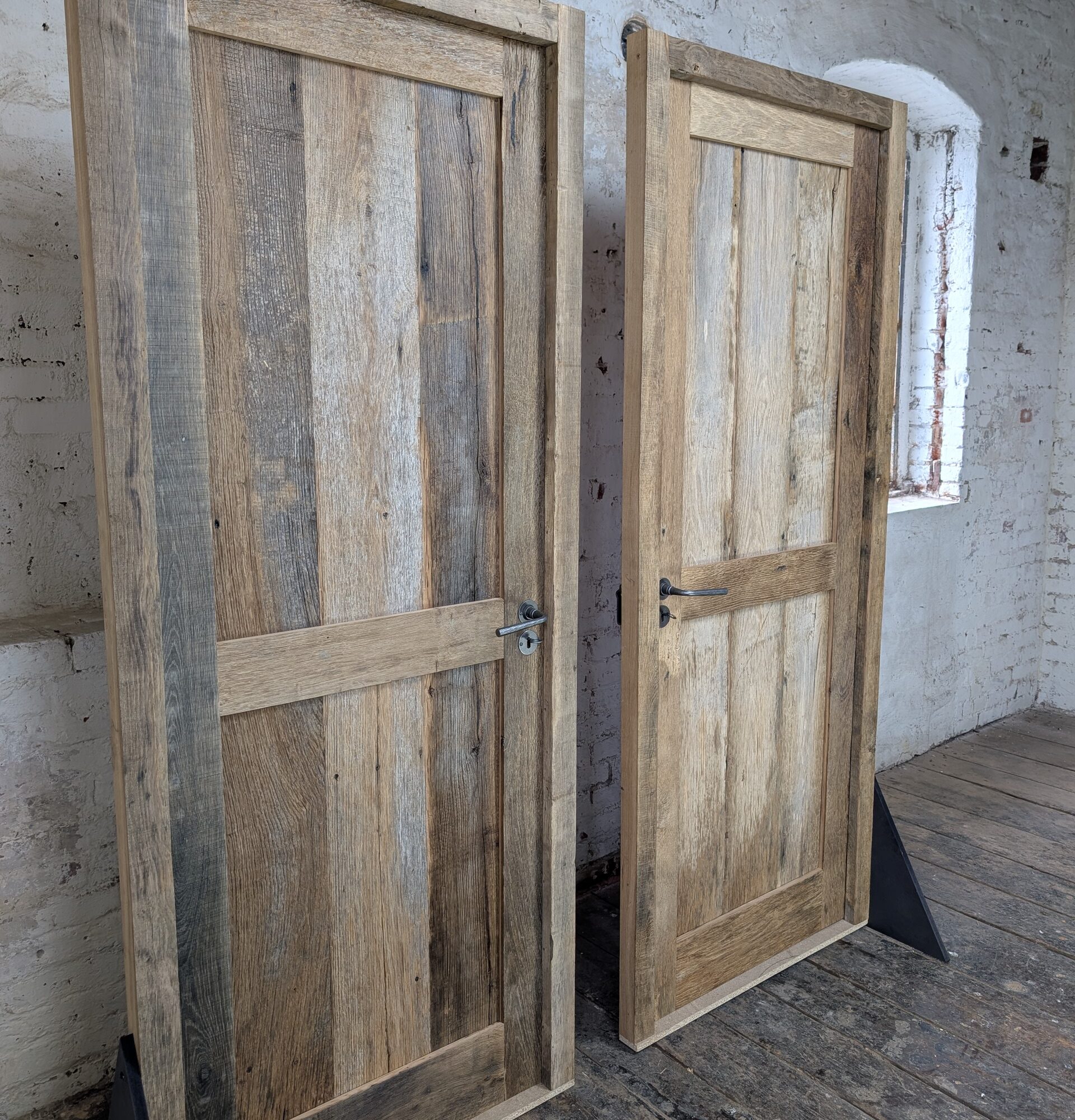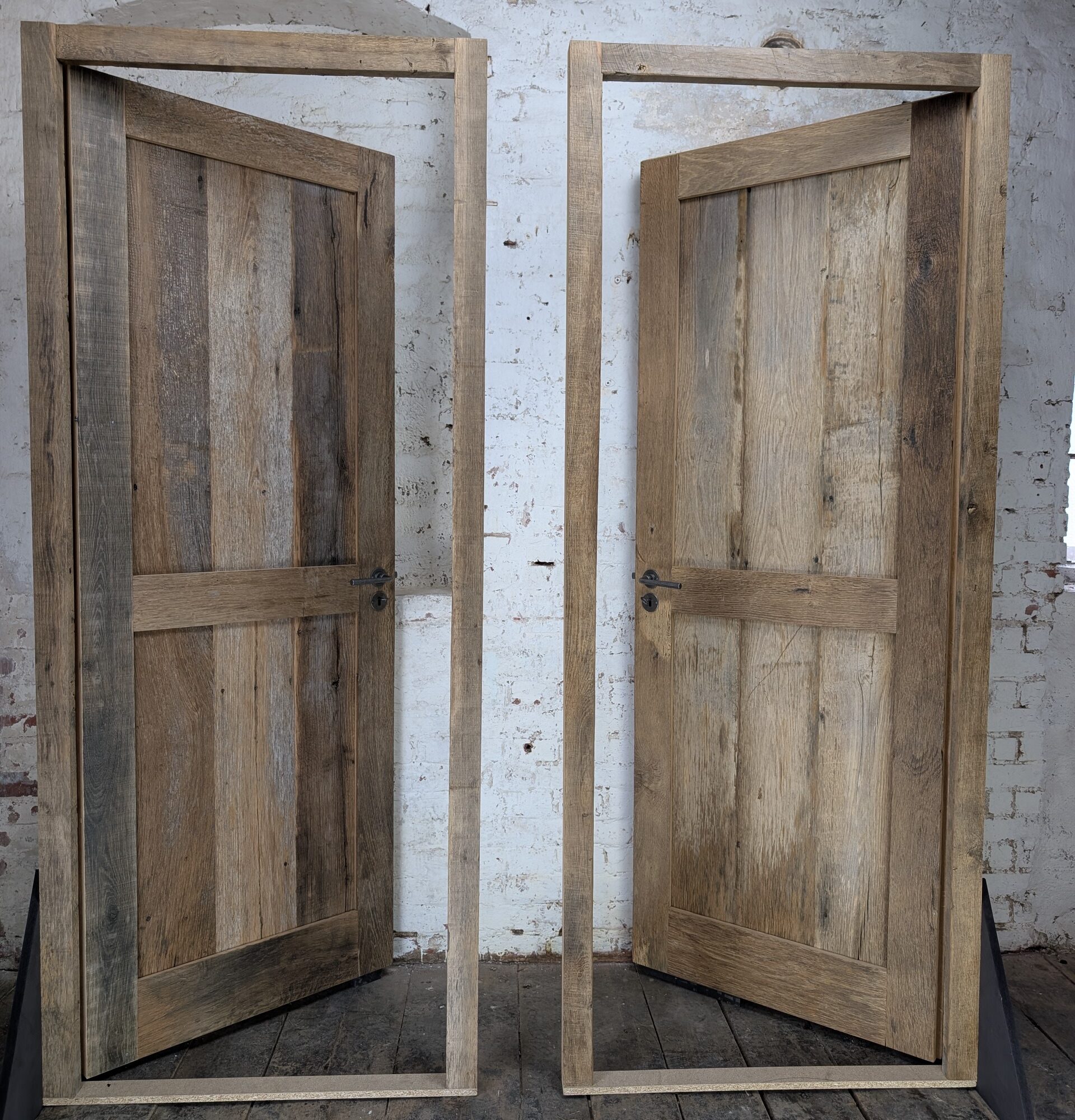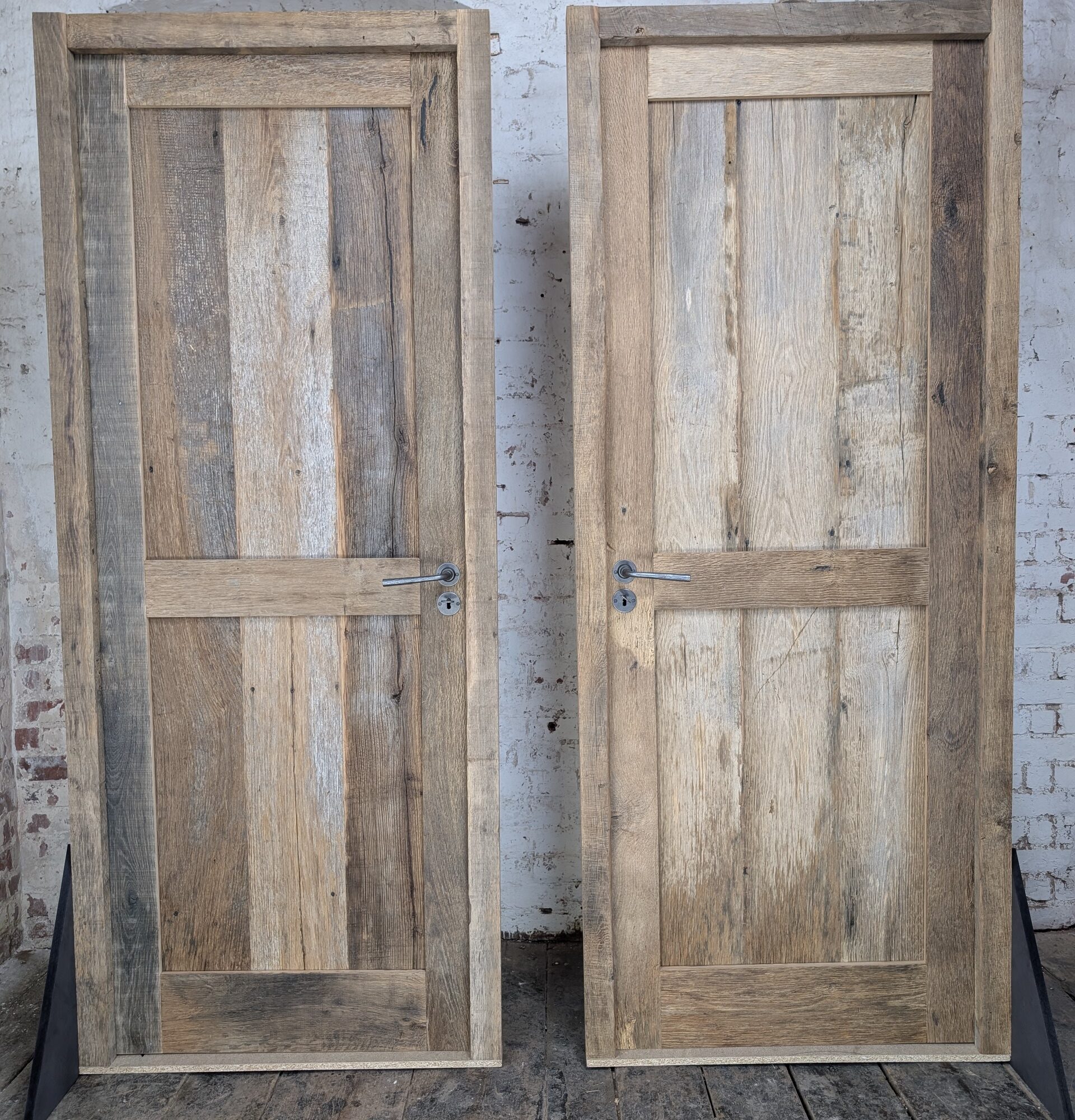 Diese Zimmertüren sind aus historischen Eichenbohlen gefertigt. Beidseitig mit original alter Oberfläche ausgeführt, bringen sie genau das mit, was man an altem Holz schätzt: Spuren der Zeit, Gebrauch, Witterung – und eine Oberfläche, die einzigartig.
